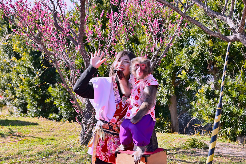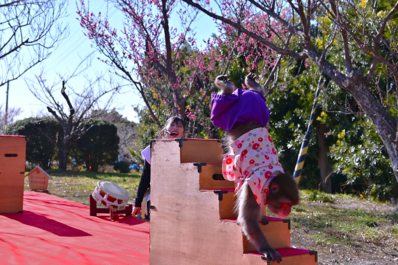 梅林公園内では猿まわしが見れたり、当日は14時からもち投げのイベントも行っております(一般のお客様も参加)